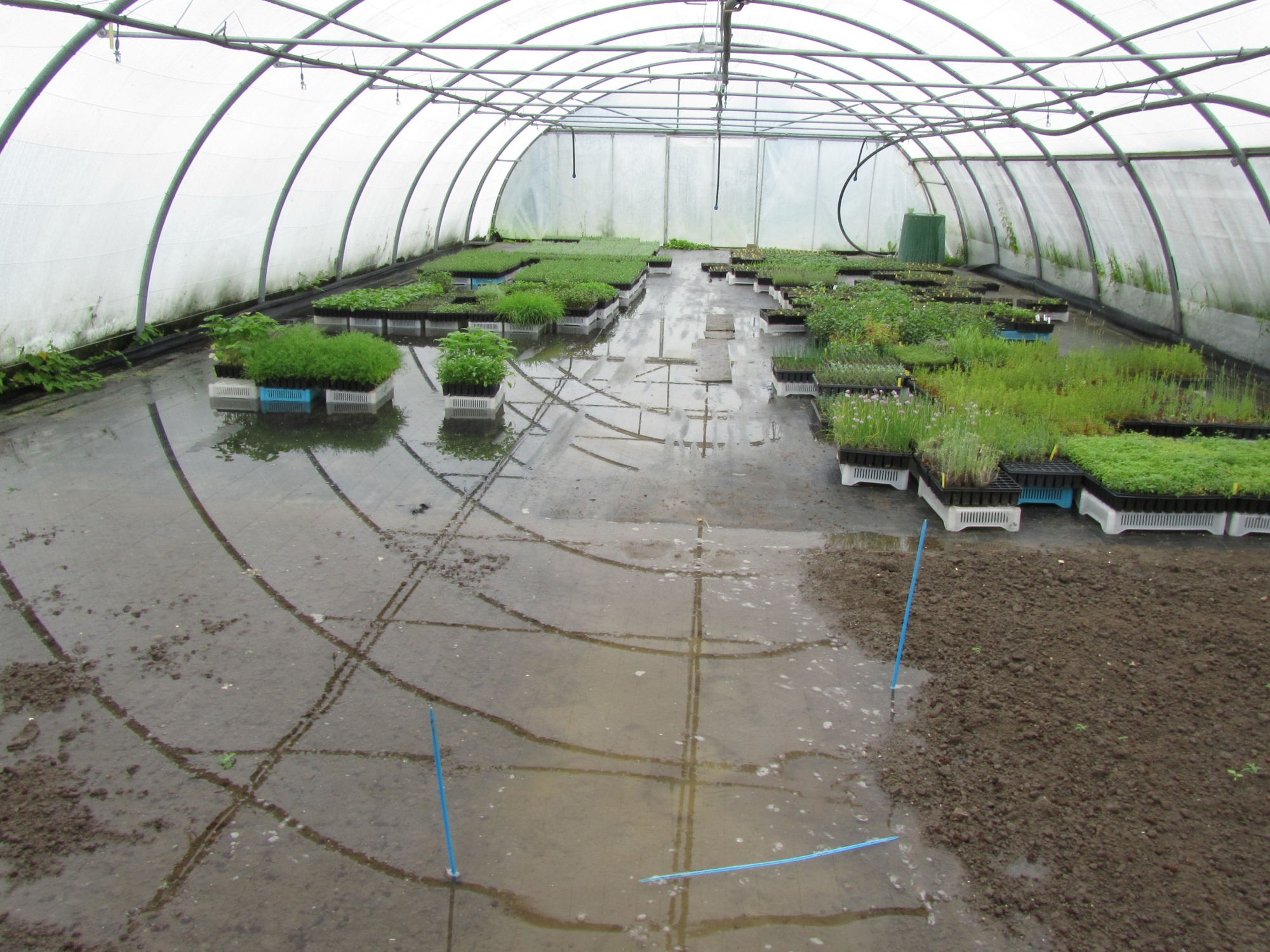 L’eau est également montée dans une partie des serres et des tunnels sans gros dégâts car toutes les plantes en godets, qui n’étaient pas sur tablette, ont pu être rehaussées. Le plus préjudiciable a été l’inondation d’un tunnel, étonnamment le plus éloigné du fossé, mais qui était en pleine terre et qui a eu beaucoup de mal à se ressuyer.
